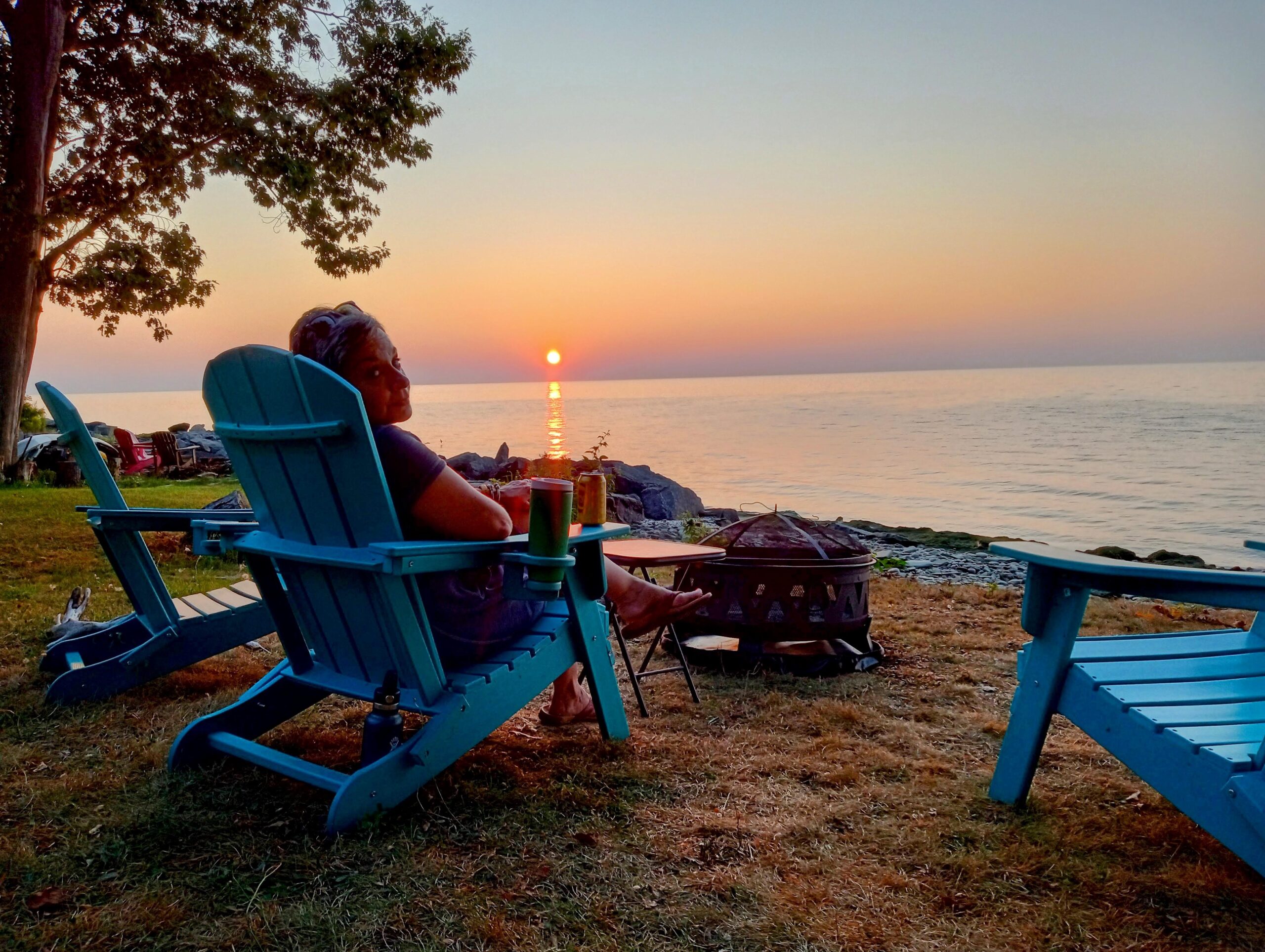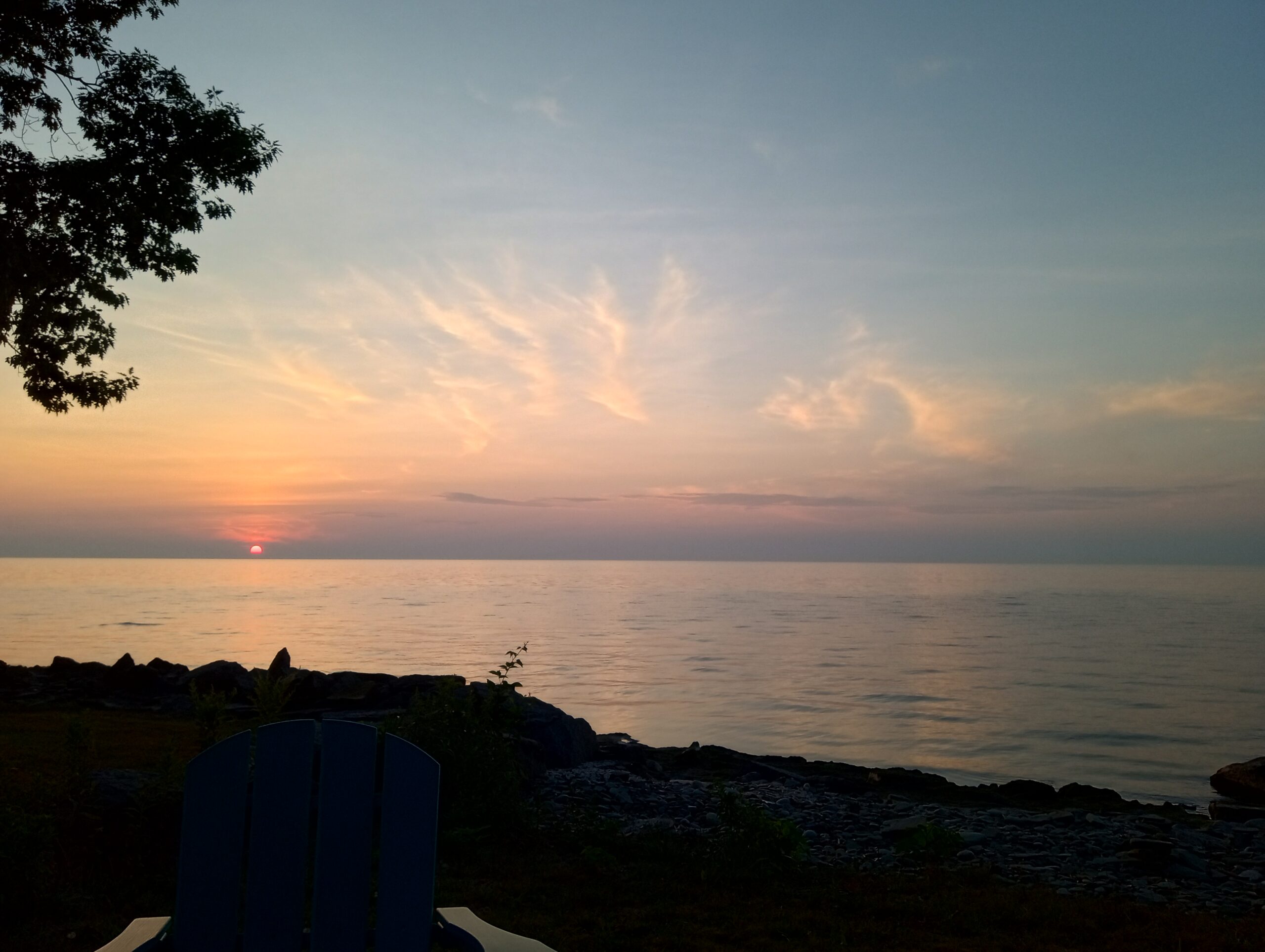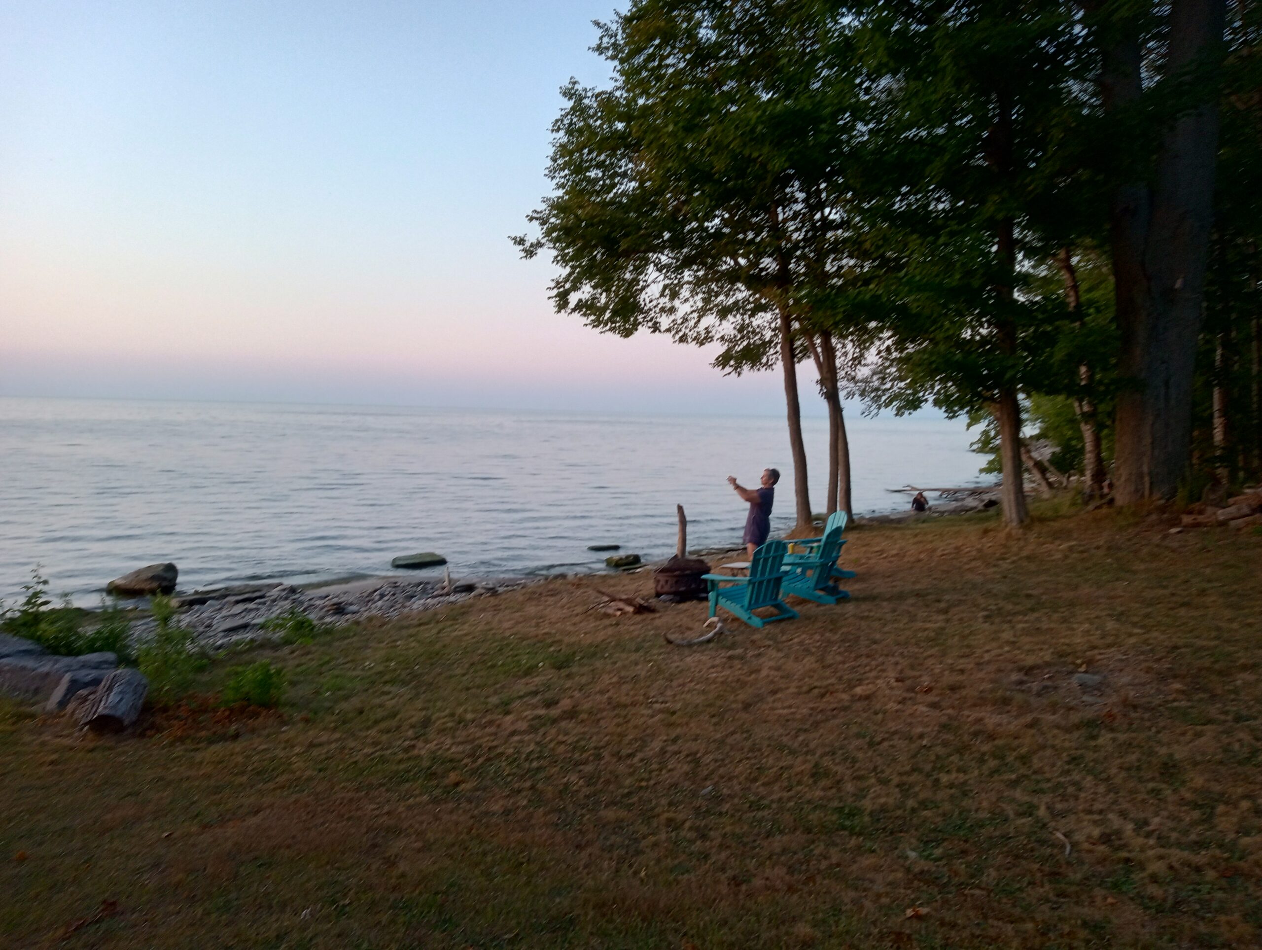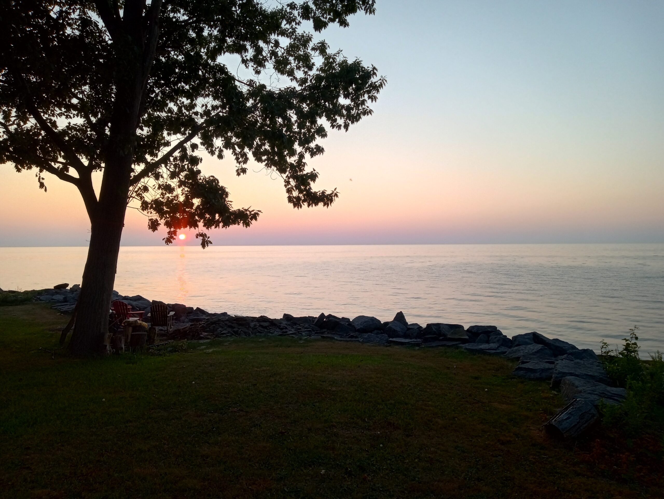 Here’s the sunset page in the photo album from Maggie’s Scriba party, Aug. 15-17, 2025. The lake was calm and quiet all day Friday and Saturday, but Sunday it was not, but blustery and turbulent instead. Sunday’s sun broke through in the nick of time to treat us to another blush of sunset, reminiscent of legendairy Hawaiian Moon ice cream from Stone’s! (See people & party pictures here.)